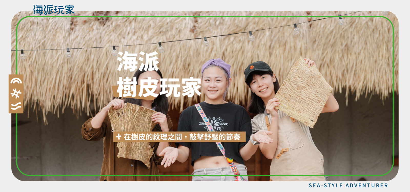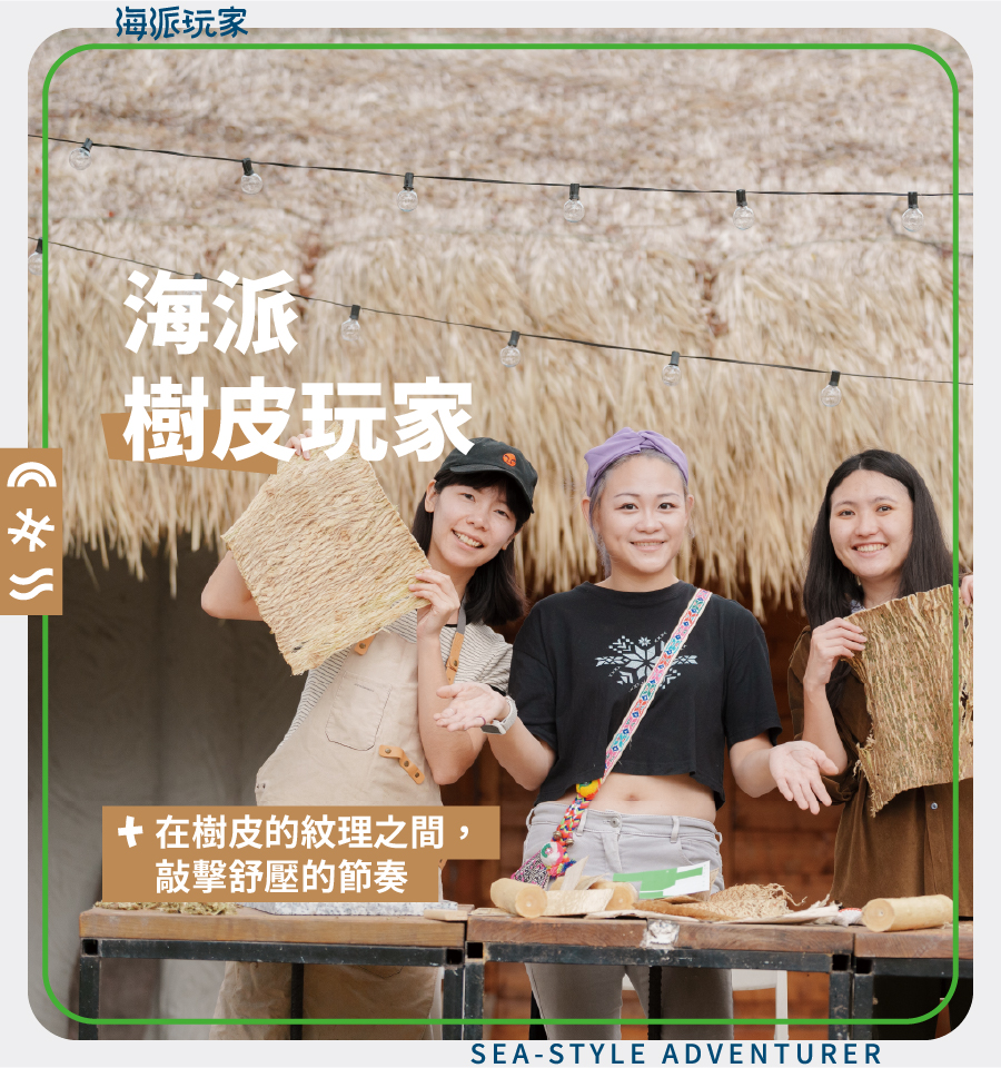 在缺乏現代工具的年代,部落生活中的一切所需都要靠族人親手製作打造,如今流傳下來的技藝是累積無數先人經驗所得的文化瑰寶。來當樹皮玩家吧!跟著深耕在地的「米麻岸工作室」走一遭阿美族的文化之旅,利用山林中的樹木,經過反覆敲打錘鍊後,搖身一變成為樹皮布,再製作成專屬於自己的生活小物,親身感受一件樹皮衣從採集到完成得來不易;也聽一聽各種大大小小的文化小故事,認識過去阿美族人搭建茅草家屋的傳統工法;認識阿美族的服飾文化。從點這些點點滴滴之中,理解阿美族母系社會文化與男子年齡階層的分工意涵,認識書本之外,真正的阿美族文化。