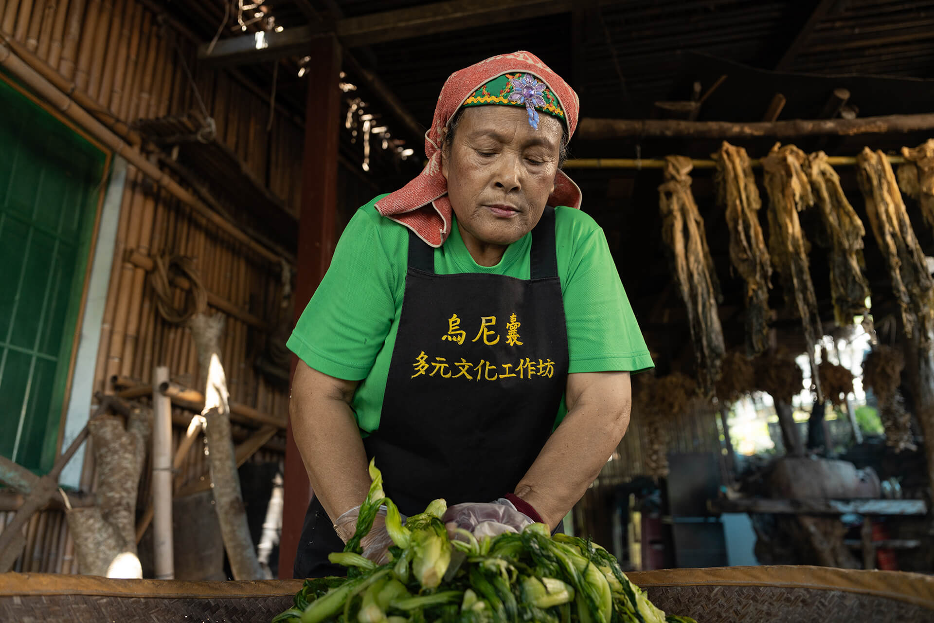 阿姨笑著回憶,童年時為了摘屋簷下的酸菜而興奮跳躍。婦女在家醃製,讓與小米一起種的芥菜,成為餐桌上的常年佳餚;獵人上山時,用煙燻的方式減輕獵物重量,延長保存時間,讓肉能順利帶回家與族人分享。