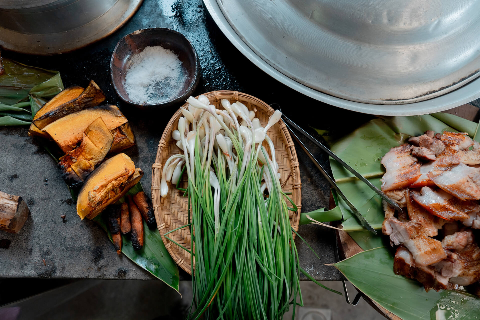 以剖半竹筒做碗,上鋪一層綠葉,依序擱入豬肉、飯、一小搓白鹽、蕗蕎,盤中色彩多姿,即是小盛宴。吃法是豬肉沾鹽,先入口,再咬一節蕗蕎,蕗蕎則是原住民的蔥蒜。豬肉焦香,蕗蕎辛辣清爽,配口飯,再喝點野菜湯,烹調簡單,直接乾脆,讓食材展露本事滋味,反而美味異常!