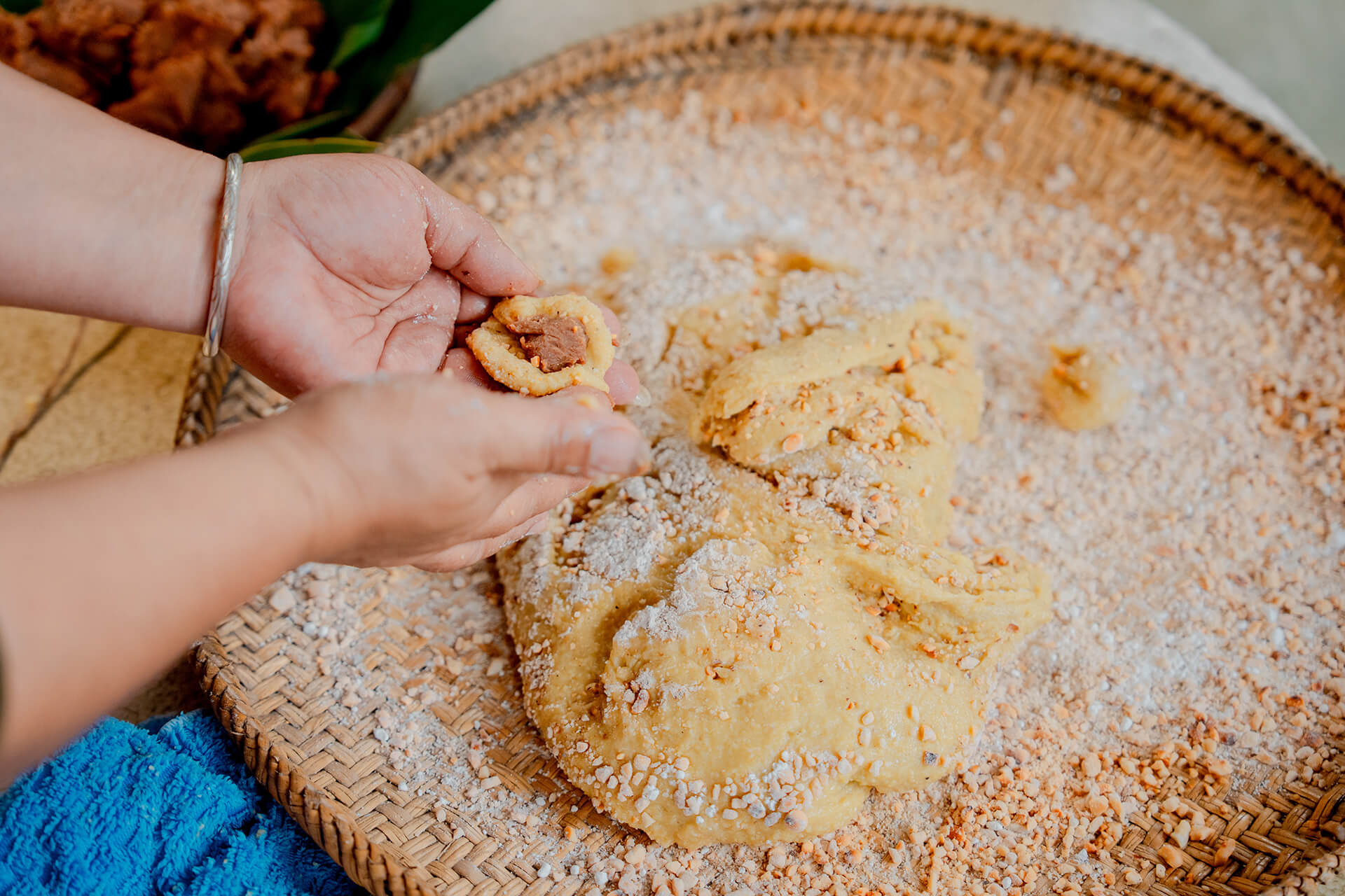 她要我們輪流搗打,直到小米成為麻糬。雖費力,大家搗的汗流浹背,卻像遊戲一樣新鮮。搗好的米團裹上花生粉,包入豆沙餡,現做的小米麻糬香氣濃郁,軟糯甜潤。這場共同勞動的溫度,或許才是最珍貴的「甜點」。