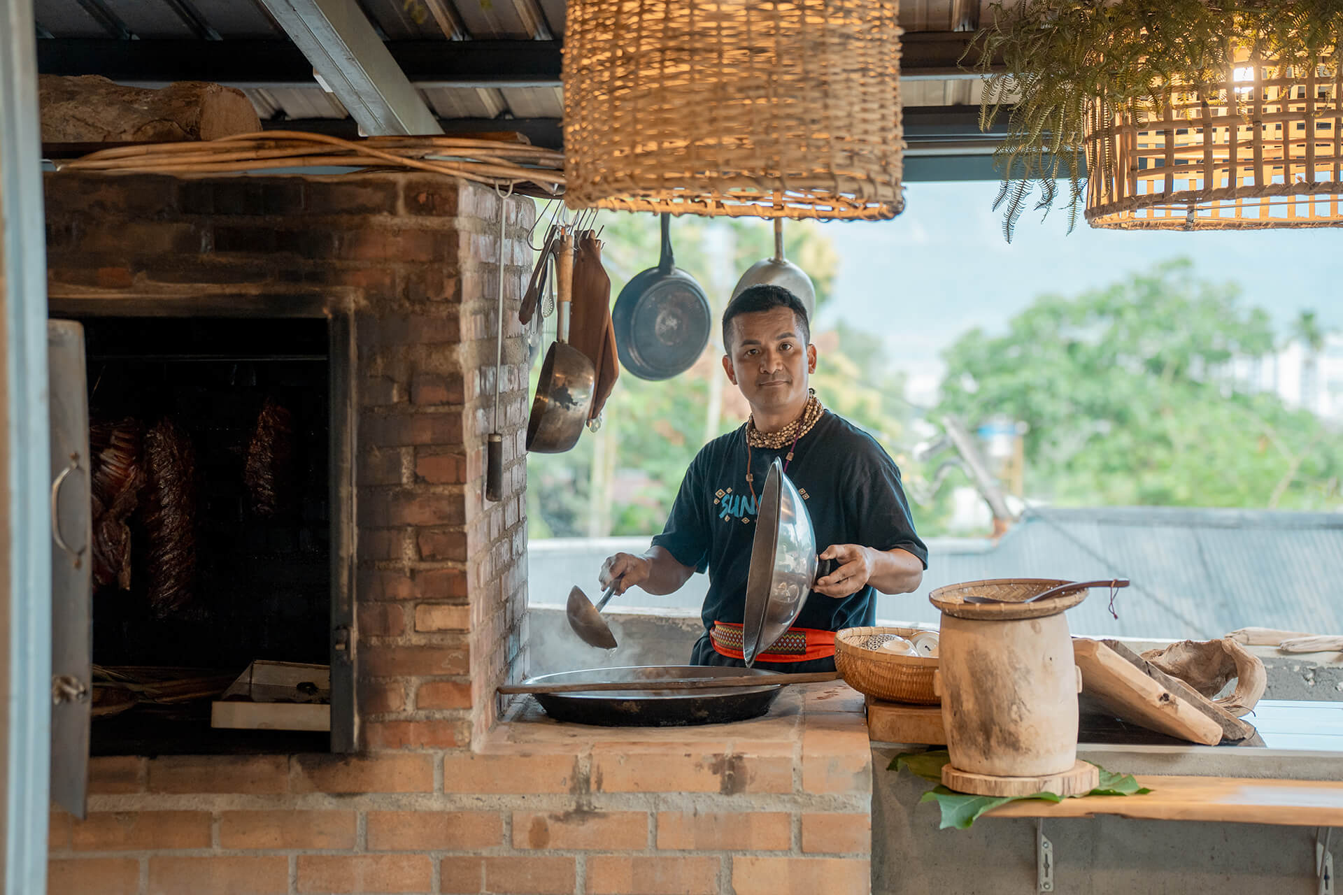 採完野菜,我們走進 tina uil 的家。柴火與烤肉交織的香氣撲鼻而來。爐上,豬肉發出誘人的「滋啦」聲,油脂滴落在紅熾炭上,冒出焦香青煙。